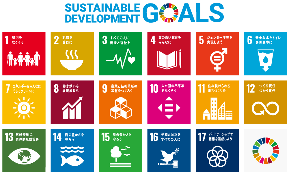2015年9月の国連サミットで採択された「持続可能な開発のための2030アジェンダ」に記載された2030年までに持続可能でよりよい世界を目指す国際目標です。